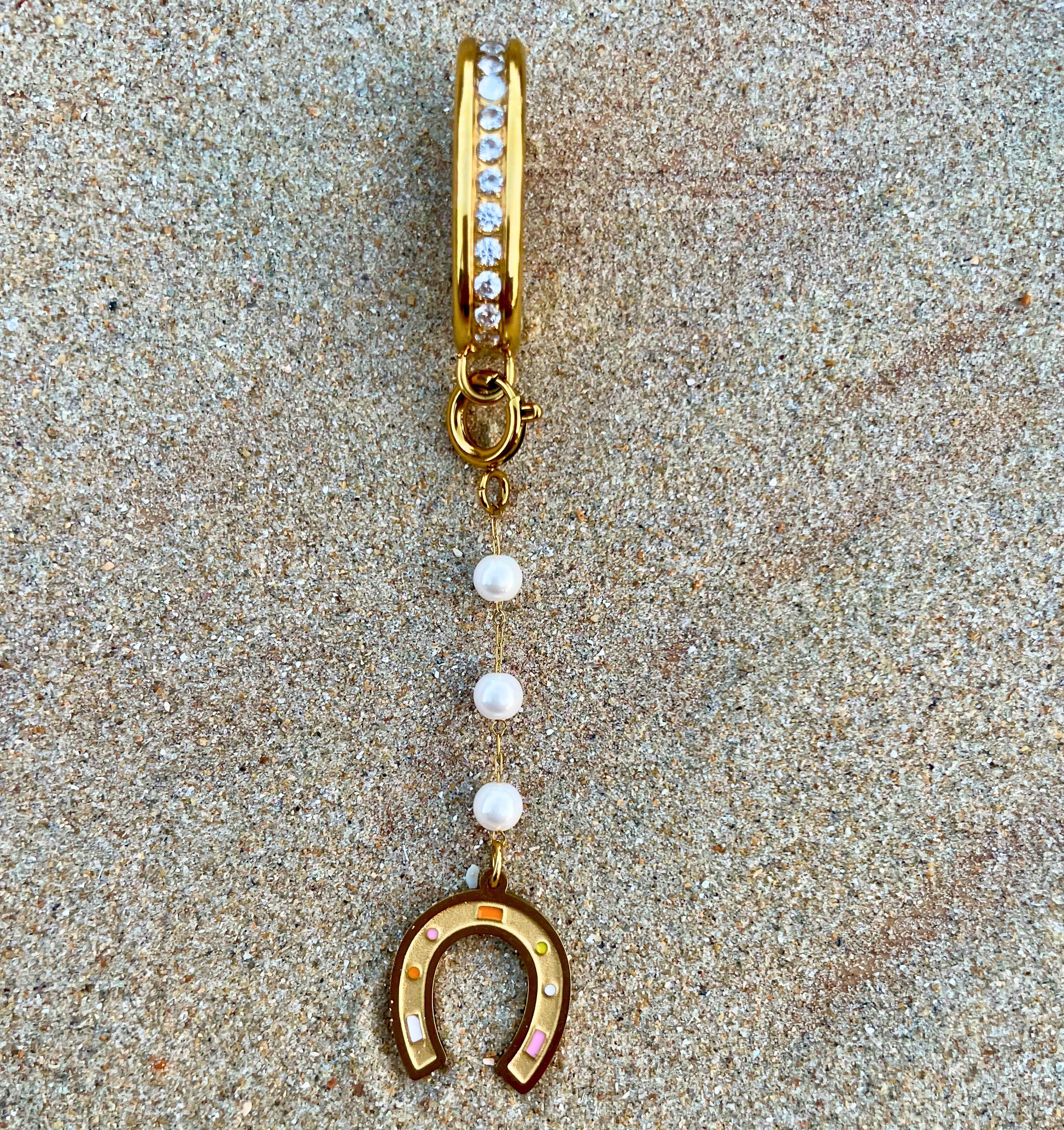 Acier inoxydable doré / Dimensions : 9,4 cm / Poids : 7 g /Design : Grand anneau doré serti de strass avec pendentif fer à cheval perlé multicolore