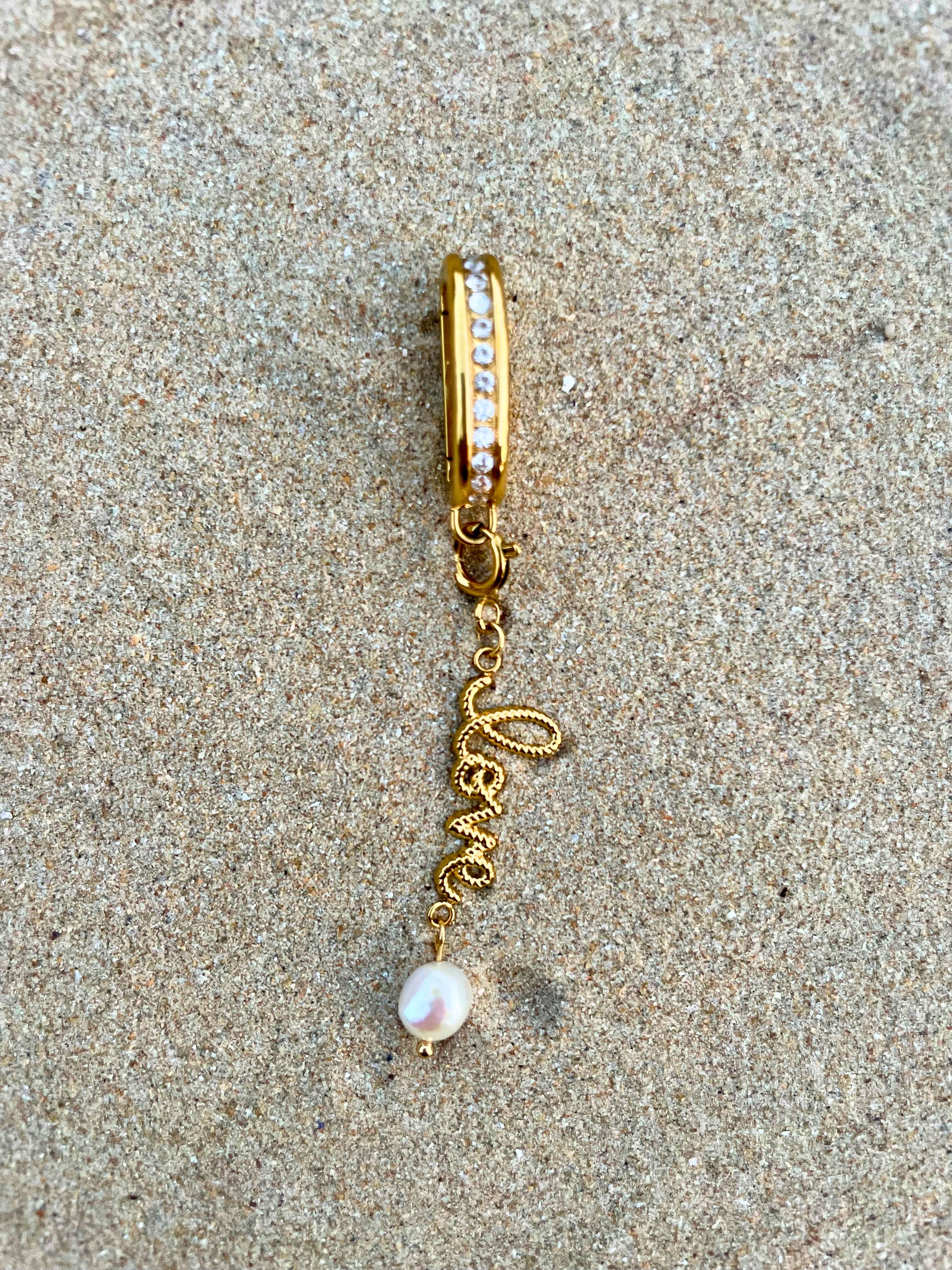 Acier inoxydable doré / Dimensions : 8,4 cm / Poids : 8 g /Design : Grand anneau doré serti de strass avec pendentif LOVE et perle.