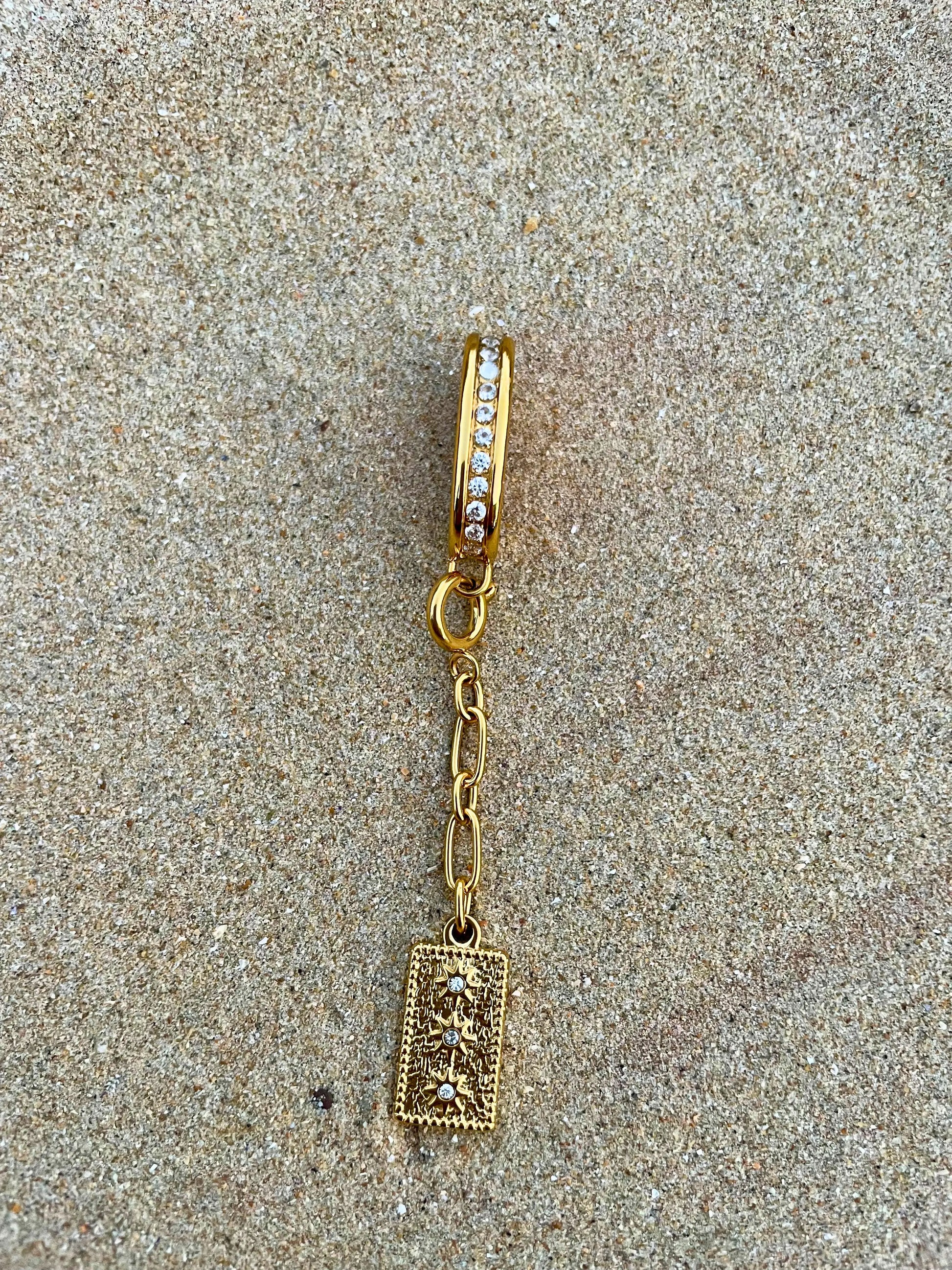 Acier inoxydable doré / Dimensions : 8,5 cm / Poids : 9 g / Design : Anneau doré serti de strass avec pendentif rectangle et trois soleils en strass.